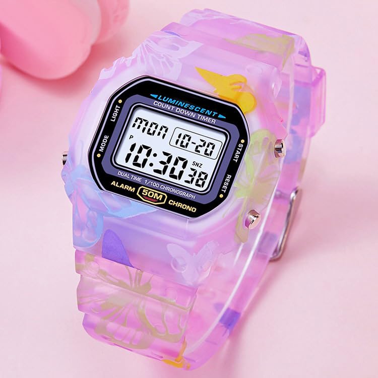 • [Colorful Strap Digital Watch]: The watch comes with a bright and colorful multi-colored strap, adorned with a butterfly design. You can choose from purple, blue, and orange colors. This sport digital watch allows you to showcase your personality and vitality, making it the perfect accessory to enhance your fashion taste. It's ideal for expressing your energy and youthfulness.