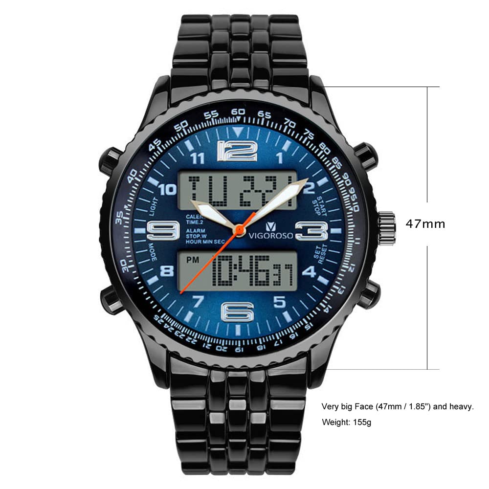 - FASHION CASUAL DESIGN: Very big face (47mm / 1.85") and heavy. Black dial with silver watch hand,black watch band. Analog&digital display design, stainless steel band with the simplicity of sports casual. Looks very simple and fashion.Suitable for all types of people.